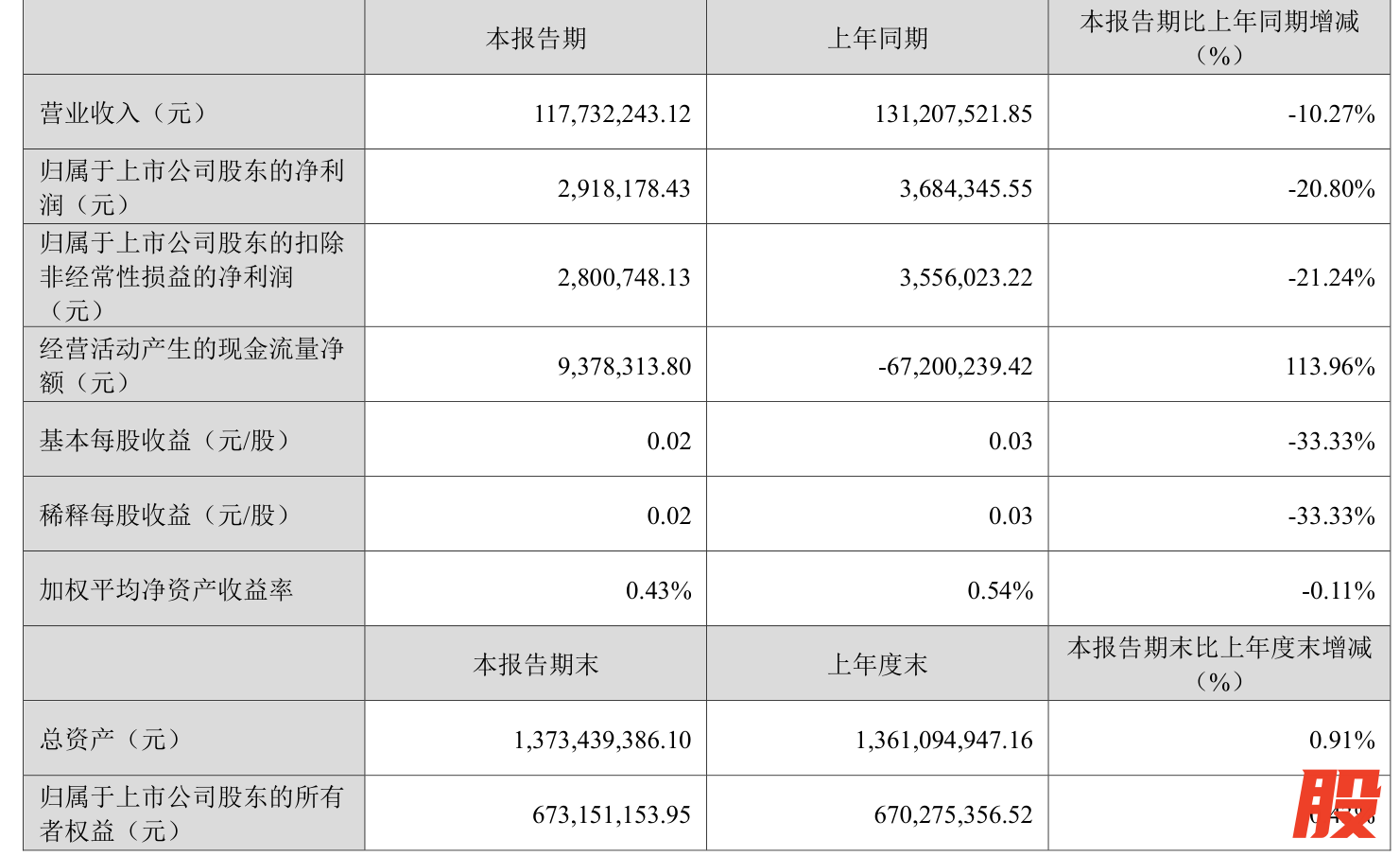 中证智能财讯名雕股份(002830)4月26日披露2025年第一季度报告。公司实现营业总收入1.18亿元,同比下降10.27%;归母净利润291.82万元,同比下降20.80%;扣非净利润280.07万元,同比下降21.24%;经营活动产生的现金流量净额为937.83万元,上年同期为-6720.02万元;报告期内,名雕股份基本每股收益为0.02元,加权平均净资产收益率为0.43%。